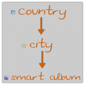 My principles are very simple. I use “Counties” as my parent folder and Cities as my placeholders to store the picture files. I am using Aperture 3 for Mac as my tool which offers “Smart Album” feature to group a specific event in the city based on keywords or metadata. For example once a year I visit Amsterdam, I then store all my pictures in folder Amsterdam and I create new “Smart Album” based on the event.